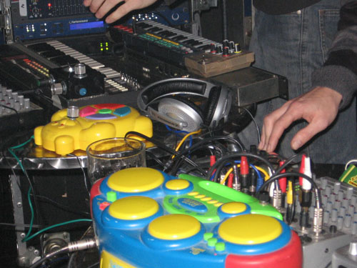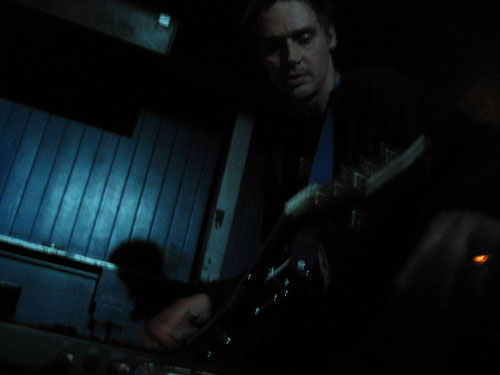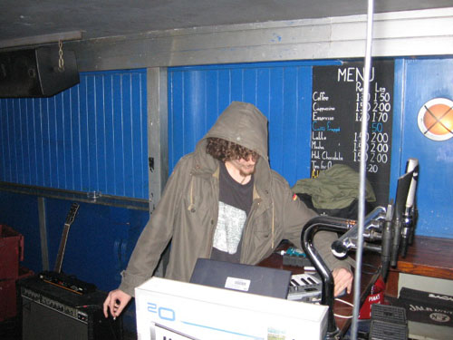 this was the first ever Club Silencio. Drawing together a varied mix of twisted electronica practitioners and noise artists mostly via that modern communications wonder; myspace, Adam fashioned an unusual and pleasurable evening of high quality and high volume electronic goodness. On a visual level, all eight acts had set up their equipment simultaneously so that the Volks resembled the inside of the starship enterprise. On a logistical level, in order to satisfy time constraints on the already seriously nocturnal show time of 11pm through to 3am, each act was given a 20 minute slot. First up was EUPHONIOUS MURMUR BLEND. At first glance a solo guitarist, EMB built from an unsettlingly quiet start into a thunderous onslaught of glitch, delay manipulation, downpitching and guitar abuse with a modicum of carefully chosen sampled sounds thrown in. Some of these appeared to have been sourced from the venue itself – I was later informed that sampling the ambient sound of a venue before the performance is standard practice for EMB; the natural reverb of Leeds Holy Trinity Church being a favourite, apparently. |