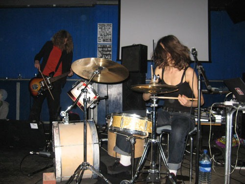 from a very early age. Having finely honed their craft on London’s arts scene over the last four years, these two lads created a stunning amalgam of break-core, bleep, noise, grinning and hardcorepunk-style shouting; seemingly simultaneously unerringly tight and on the verge of collapse. With syncopated movements and almost turntablist-like rigour on circuit-bent kids toys and other unrecognisable devices spewing out their unnatural barrage of clatter, DJ Tendraw & the Gypsies Dog captivated the audience while looking all the while noticeably un-demonic in their smart-casual attire and sensible haircuts. Smart casual would certainly not be a term one could apply to the night’s host ADAM LYGO. A tall, thin man sporting voluminous, black garments and a sparkly silver Gretch guitar, Mr Lygo spent his vigorous 20 minutes alternately spitefully prodding his tableful of digital effects into overload or violently sawing away at his guitar in a heads-down hardcore stylee. His overlaid distorted guitar loop technique impresses in the same way Masami Tsuchiya’s playing did, (the only member of Japan who was actually Japanese) - not only because it wasn’t immediately obvious how his sounds were being generated but also because of the curiously alien qualities of the sounds themselves. |