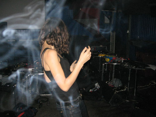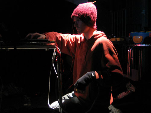 history of rock and roll although sounding anything but, were ARIES. A boy/girl bowed fx guitar and drums outfit with plenty of hair to shake, Aries made a solemn and pounding drone riot. Following that and making a nice contrast, was the break/splatter/blat-core of the mysterious gentleman going by the name 197. Dense, hard-cut, fast edits with a dancefloor-frenzy potential that would work just as well while comatose, 197 went in hard and fast with his german parka hood up, clutching a perpetual roll-up while stabbing sullenly at his laptop and midi controller. As they say in the jazz world; nice. Turning in the night’s most interesting performance (of the theatrical variety) was another young man with laptop going under the name ZEROPOINTENERGY. Using some kind of self-designed motion control system, with sensors attached to his hands and head, Zeropointenergy used his own twitchy movements to manipulate the squishy, tech output from whatever software it was he had running. Never falling into the trap of actually starting to dance, and thus potentially ruining everything, he instead took advantage of being able to appear to be transported/taken over by the technology itself. Quite successful and very entertaining; the effect was also compounded by the unfamiliar nature of his sounds. |